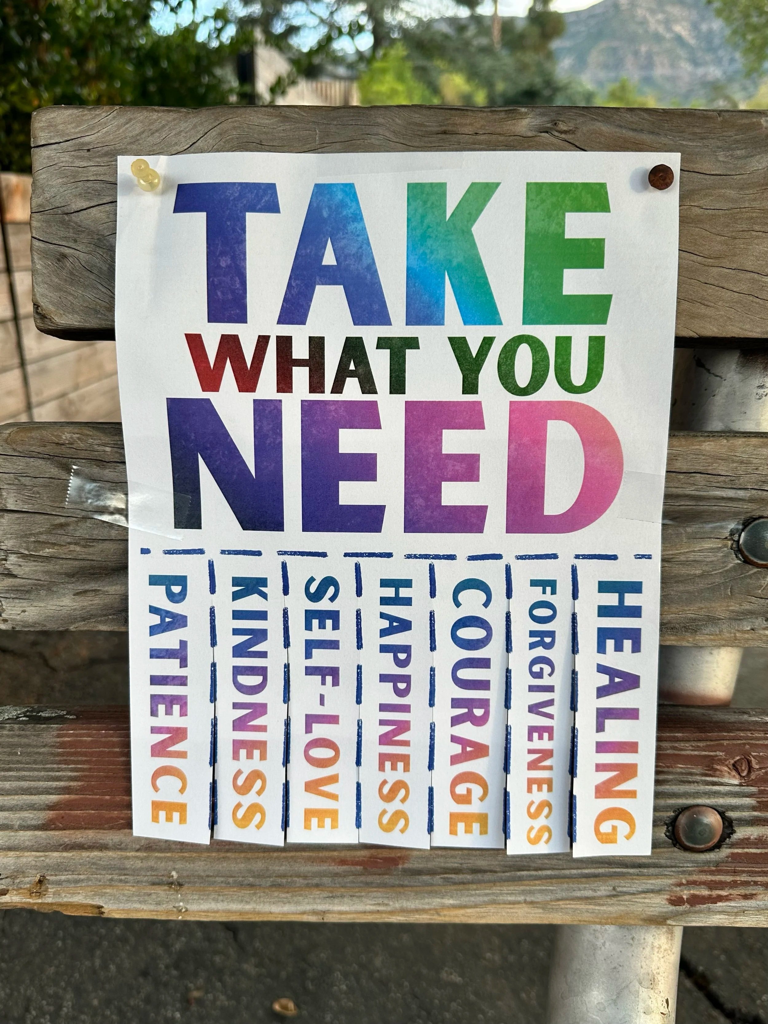 One example is the “Take What You Need” kindness flyer project — a small piece of street art designed to offer encouragement to strangers passing by.